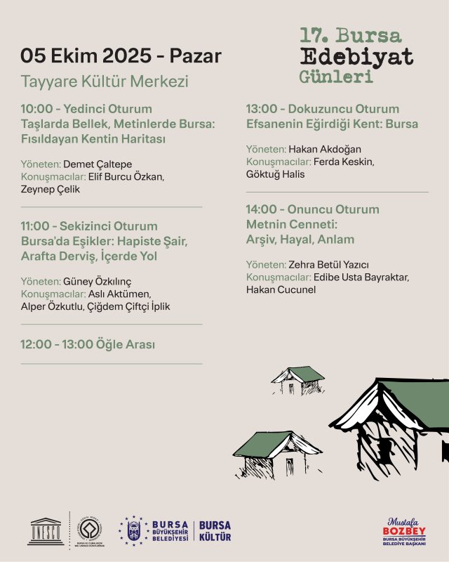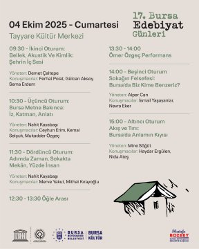 3-4-5 Ekim 2025 tarihlerinde, Tayyare Kültür Merkezi’nde Bursa’nın kimliğini, geçmişini, bugününü ve geleceğini birlikte konuşacağız.