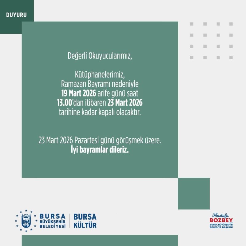 Okuyucularımız, değerli harcamalarımız Ramazan Bayramı nedeniyle 19 Mart arife günü saat 13.00'dan itibaren 23 Mart 2026 tarihine kadar kapalı olacaktır. 23 Mart 2026 Pazartesi günü seçildi. İyi bayramlar sizi bekliyor.