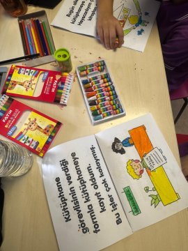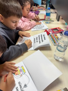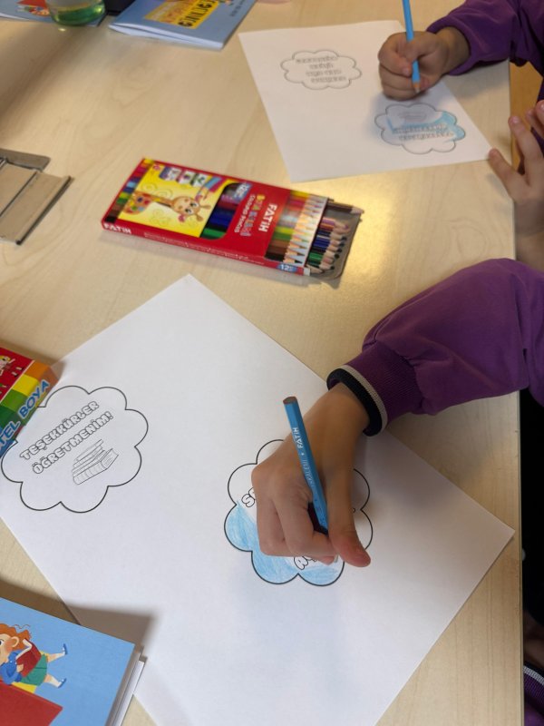 Ardından, Öğretmenler Günü’ne özel kartpostal tasarladılar. Çiçeklerini boyadılar, süslediler ve öğretmenlerine kendi elleriyle hazırladıkları rengârenk teşekkür kartlarını hazırladılar.